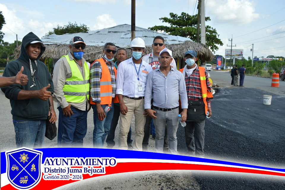 El Lic. Osiris Martínez Director Municipal Juma Bejucal en coordinación con el ING Antoni y el ING Geury supervisores de obras públicas. El día de hoy agotaron una agitada agenda de trabajo que inició en la calle la Dominicana y culminó en la rotonda del mango de Pepe, en la cual se remozo con asfalto, mejorando significativamente la calidad de la vía pública para los transeúntes.