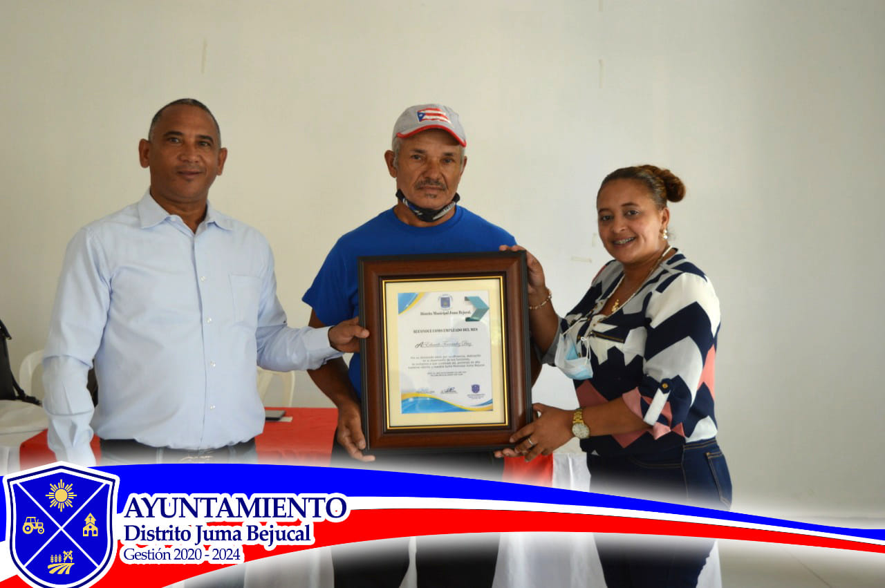 Lic. Osiris Martínez Director Municipal en conjunto con la licda Lillianna Ferreira Enc. Recursos humanos han reconocido por primera vez en la historia pública del distrito Juma Bejucal, el desempeño formidable de los empleados y colaboradores pero en especial a Eduardo Fernández Diaz, quien ha dado todo por cumplir con sus funciones y estar siempre más que dispuesto en cada momento que se le ha requerido en momentos extraoficiales. Por tal razón es galardonado como empleado del mes.